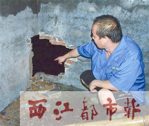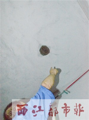 ????三樓的一間房間內,天花板也被擊出一個碗口大的窟窿。記者 趙洋/攝