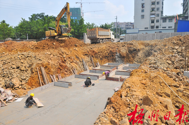 ????7月30日,在萬秀區110千伏錢鑒變電站工程工地,工人正進行配電樓地基施工。