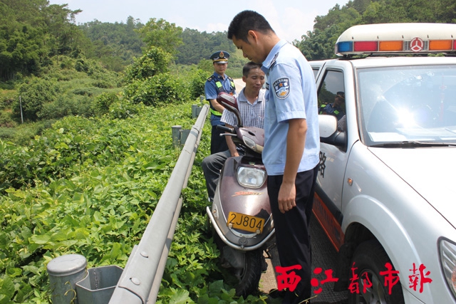 ????據介紹,8月3日11時許,梧州市交警支隊高速三大隊接到警情,稱有一輛女裝摩托車正沿著G80線廣昆高速公路岑溪段,從岑溪往玉林方向行駛。隨后,交警一邊驅車前往事發路段,一邊將相關情況告知岑興路政巡邏車。當時,剛好在執行巡邏任務的路政人員得知情況后,便立即開展搜尋工作,不久后就發現了目標。
