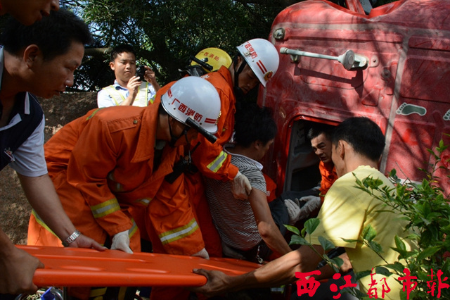 ????西江都市報(bào)訊 8月7日,在國道207線廣西岑溪市糯垌鎮(zhèn)綠云村段,一輛重型自卸貨車下坡時(shí),刮倒一輛正上坡的無號(hào)牌摩托車后發(fā)生側(cè)翻,貨車司機(jī)一度被困駕駛室,生命垂危。岑溪市警方聞?dòng)嵑缶o急出動(dòng),經(jīng)過交警及消防官兵的積極救援,成功解救被困貨車司機(jī)。