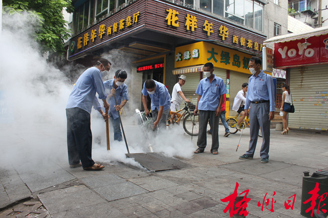 ????8月12日,在新興一路,市愛衛(wèi)辦組織的專業(yè)“除四害”隊伍正在用熱煙霧機,對污水下水道噴灑熱煙霧劑,進行專業(yè)的蟑螂防治。 陳曉雯 攝????