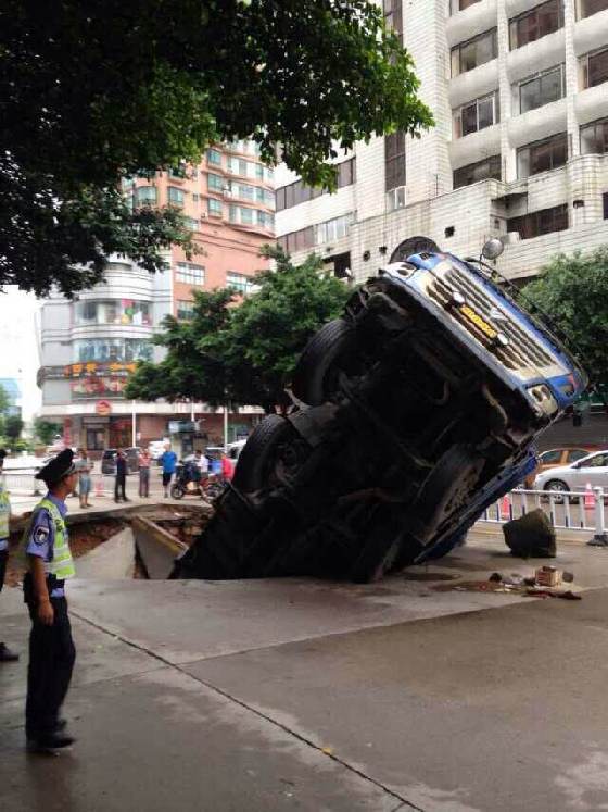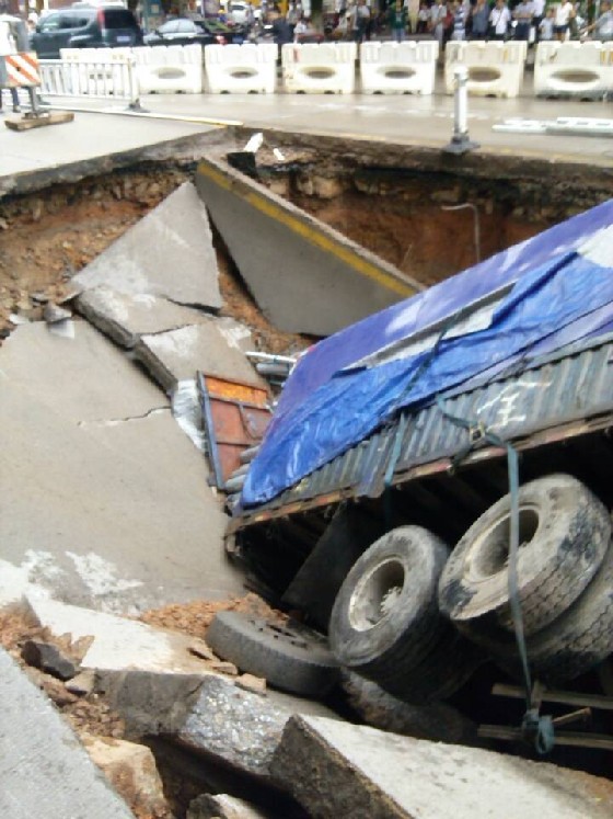 ????貨車司機杜先生告訴記者,車上的運載都是空心的鋼管,今天凌晨3點50分他開著車行駛到該路段,突然聽到很大的響聲,隨后貨車尾部就掉到坑內,幸虧車頭還卡在路面,沒有對他造成傷害。杜先生指著塌陷的路面說,“路面底下的泥土大部分被掏空,加上這段時間該路段多次內澇,致使底下泥土松軟、垮塌,路面水泥板塊的承重能力下降,最終才造成這起事故。”