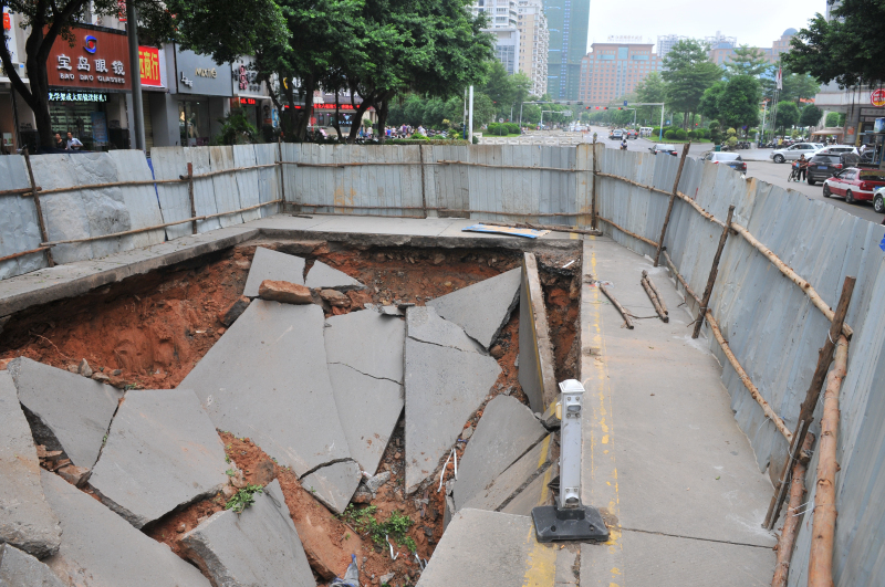 ?8月15日,在新興二路西環轉盤處,市政工人正往下水道探查受損情況。據悉,14日凌晨發生塌陷的路面目前已經被交警、市政部門用鐵板圍蔽。市政部門有關負責人介紹,相關專家已對塌陷點進行了勘查,目前安排了工人定時對塌陷點周邊道路及下水道進行檢查,以防發生二次災害。李鴻榮 徐新榮 攝
