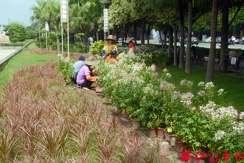 8月16日,綠化工作人員在西堤公園的綠化帶上移栽雅致的景觀花卉。 為了保持西堤公園的綠化效果,綠化部門根據季節的變化及時對西堤公園的綠化景觀植物或調整,或增植,保證綠化帶景色四季靚麗怡人。 本報記者 蒙紹松/攝