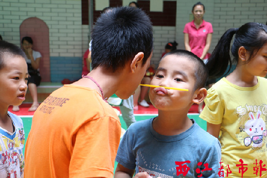 在愛心游園活動中,孩子們正在進行“嘟嘴傳吸管”的游戲。