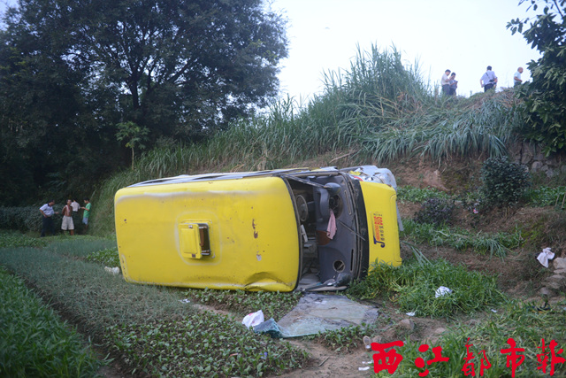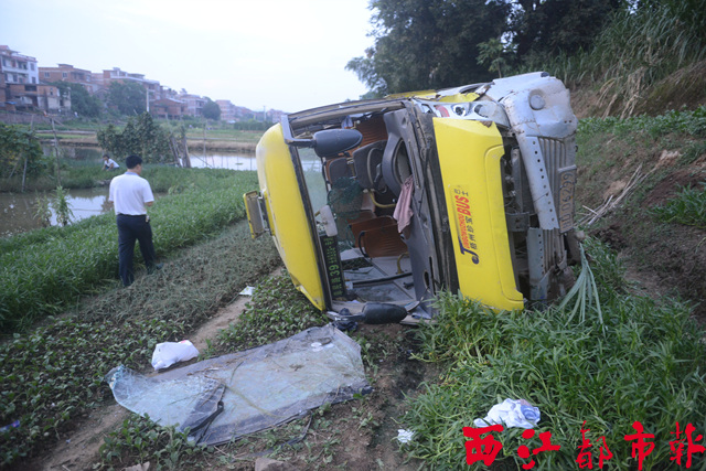 ??? 昨日17時許,珍寶巴士39路公交車在行至梧州市長洲島堤后路時,翻下約6米落差的菜地。車上四位乘客在此次事故中受輕傷。 本報記者 蒙紹松/攝