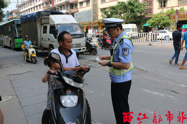 在整治中,交警對一名違規搭載未滿12歲兒童的電動車車主進行宣傳教育。楊珊/攝