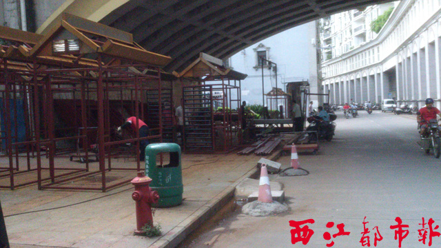 ????8月22日上午,記者到桂江一橋橋底走訪,只見現場有幾名施工人員正在焊接鋼材,準備將其做成亭子狀框架,鋼材旁邊擺放著三四個已焊接好的亭子,人行道地面上滿是切割鋼材后留下的粉塵。據附近街坊反映,這項工作已進行了一段時間。