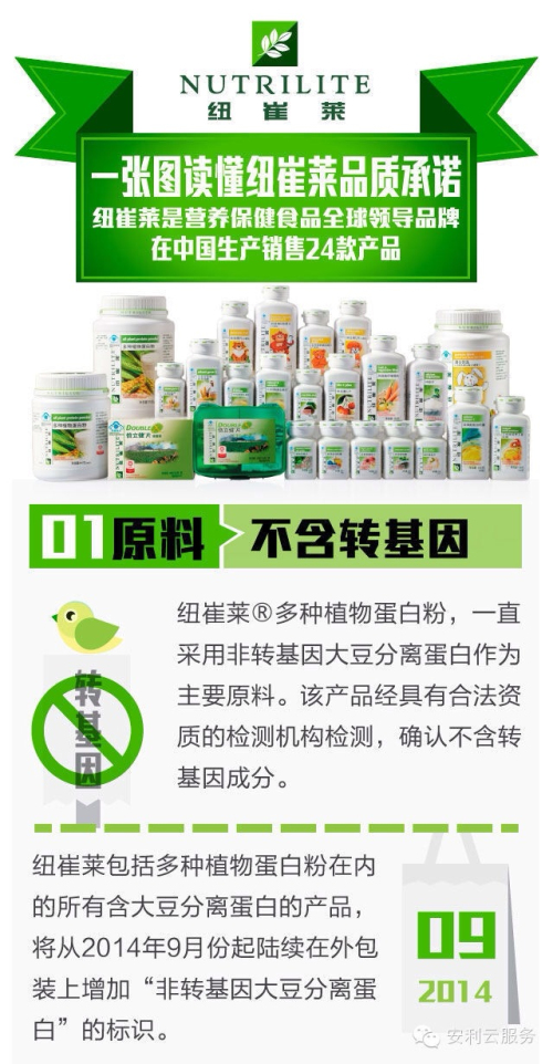 ??? 紐崔萊一直秉承“自然的精華,科學的精粹”的理念,全球生產基地都采用統一的高標準,不使用轉基因大豆蛋白原料。安利大中華研究開發及技術法規副總裁陳佳表示,從9月1日起,紐崔萊蛋白粉將啟用增加了“非轉基因大豆分離蛋白”標識的新產品包裝。