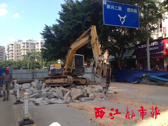 ????當(dāng)天下午,一臺(tái)風(fēng)炮機(jī)駛進(jìn)新興二路廣宇豪庭對(duì)出路段塌陷區(qū)域,開始進(jìn)行混凝土破挖。市政工作人員與地下管線的各單位代表也來到現(xiàn)場(chǎng),協(xié)調(diào)現(xiàn)場(chǎng)的施工作業(yè)。據(jù)現(xiàn)場(chǎng)的工作人員黎先生介紹,由于需修復(fù)的市政大渠渠道位于該道路中央隔離欄的下方,因而需要進(jìn)一步開挖路邊。具體開挖范圍為,東西向?qū)⒁愿綦x欄為中心,向兩邊開挖;南北向從新興二路與新興珠寶路路口交界開始,一直延續(xù)到新興二路的翠微居門前。開挖寬度為9.5米至16米,開挖總長約48米,深度為約6米。開挖后,工作人員將會(huì)以渠道原底板為基礎(chǔ),在此基礎(chǔ)上新建直徑為2.4米的玻璃鋼夾砂管,并通過管內(nèi)管的方式,實(shí)現(xiàn)渠道內(nèi)排水的導(dǎo)流。待玻璃鋼夾砂管建設(shè)完成后,其周圍將做進(jìn)一步的加強(qiáng)加固。