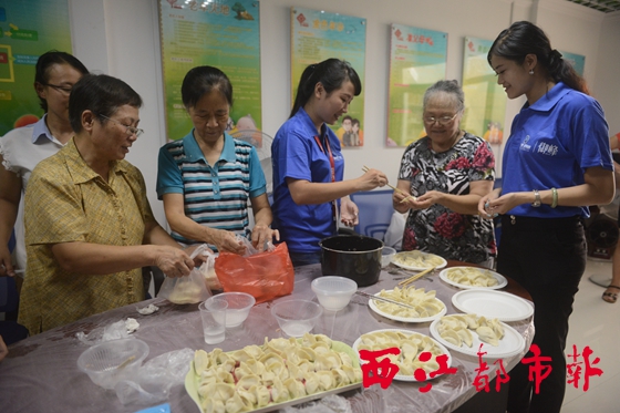 ??? 西江都市報訊(記者 陳素雅)飄香的田螺、熱騰騰的餃子,9月4日,一次特殊的中秋團圓宴在大塘街道辦內開席。當天,由共青團梧州日報社委員會發起的“愛心直通車”團委愛心聯盟,組織梧州日報社團委、梧州市第一幼兒園團委、梧州深燃天然氣有限公司團委、廣西梧州粵成房地產開發有限公司愛心志愿者,以及長洲區大塘街道辦事處的工作人員,為轄區內的空巢老人舉辦了一場愛心聚餐活動。在歡聲笑語之中,團員義工們為老人們送去節日的祝福,傳遞溫暖的關懷。