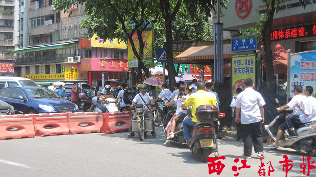 ????在大學路靠近三云轉盤方向的路口處,施工單位已經用水馬將施工區域隔離起來。盡管梧州市公安部門與市政部門已經在現場張貼公告,說明“在9月4日至20日對大學路進行全封閉施工,途經車輛、行人請繞道而行”。但記者發現,此處一個最靠邊的水馬已被人為移開,不斷有摩托車、自行車甚至小車從這個空隙中進出,交通秩序較為混亂。同時,更有不少車主把水馬前方的區域當成臨時停車場,直接將私家車停放在道路上,數量最多時達到十幾輛,直接影響了周邊車輛的通行。