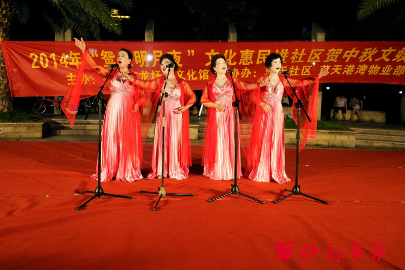???? 9月6日晚,由梧州市龍圩區文化館主辦的“鴛江明月夜”文化惠民進社區賀中秋文娛活動,在藍天港灣花圃舉行。