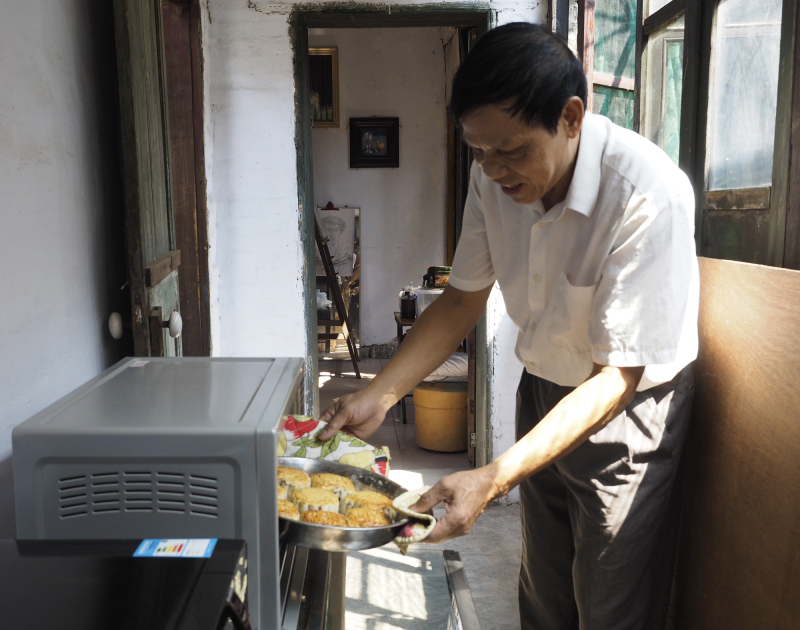 看到新鮮出爐的月餅,周振中露出了開心的笑容。
