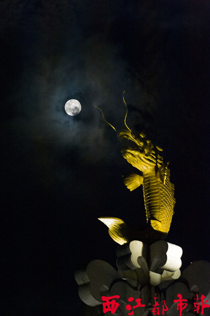 ????9月8日晚,在梧州市三龍大道龍魚雕塑轉(zhuǎn)盤處,月亮剛好掠過雕塑上方,形成有趣的“龍吐珠”景觀。