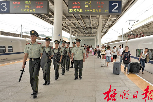 ????針對(duì)中秋節(jié)小長(zhǎng)假外出車輛多、親朋聚會(huì)多、外出旅游多的實(shí)際,武警梧州市支隊(duì)派出官兵,加強(qiáng)對(duì)南廣鐵路梧州南站、梧州火車站等公共場(chǎng)所的巡邏,并延長(zhǎng)執(zhí)勤時(shí)間,確保旅客、市民群眾節(jié)日安全。 孟亞西 李卓凡 攝