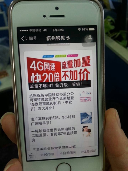 ????據(jù)了解,今年6月梧州移動(dòng)正式推出官方微信公眾服務(wù)號(hào)“梧州移動(dòng)”,以個(gè)性化的新型平臺(tái)為客戶提供省錢(qián)理財(cái)服務(wù)。該平臺(tái)運(yùn)行以來(lái),通過(guò)對(duì)其模塊的優(yōu)化管理,目前已設(shè)置了“4G專區(qū)、自助服務(wù)和優(yōu)惠活動(dòng)”三個(gè)模塊,并下設(shè)了如何使用4G、資費(fèi)查詢、話費(fèi)充值和業(yè)務(wù)辦理等多個(gè)功能選項(xiàng)。微信用戶通過(guò)“梧州移動(dòng)”微信平臺(tái),進(jìn)入相應(yīng)模塊選擇自己所需的服務(wù)選項(xiàng),就可連接到中國(guó)移動(dòng)廣西公司掌上營(yíng)業(yè)廳進(jìn)行業(yè)務(wù)的操作辦理。