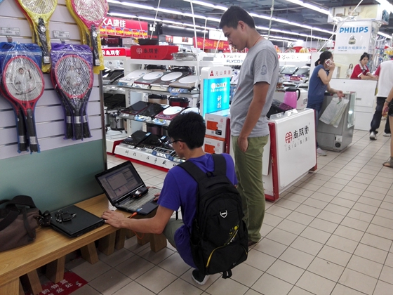 移動(dòng)服務(wù)團(tuán)隊(duì)在南城超市開(kāi)展“辦公區(qū)域網(wǎng)絡(luò)檢測(cè)優(yōu)化服務(wù)”,圖為技術(shù)人員正在進(jìn)行網(wǎng)絡(luò)檢測(cè)服務(wù)。
