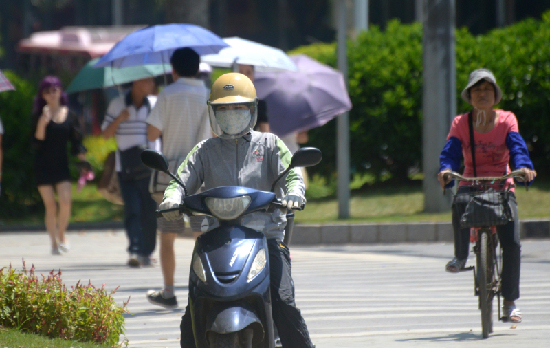 ????9月12日,烈日下,做足防曬措施的市民駕駛電動車出行。當天,梧州市區(qū)最高氣溫為34℃。連日來,市區(qū)氣溫居高不下,悶熱的天氣使人仿佛又“回到盛夏”。 記者 蒙紹松/攝