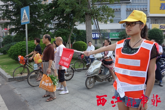 ????2014年“我為城市建設出份力”文明交通勸導青年志愿服務活動又吹響號角。從7月21日至10月30日,600多名志愿者于每天早上和下午的出行高峰期,在寶石城路口進行交通勸導,對行人亂闖紅燈、不走斑馬線等道路交通違規(guī)行為進行勸導,引導市民遵守交通規(guī)則。