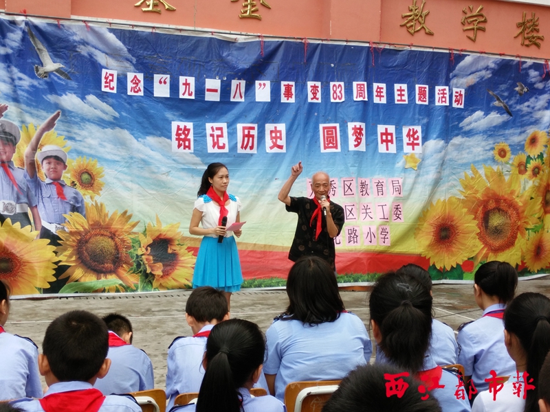 ????“你們要銘記抗戰(zhàn)歷史,珍惜現(xiàn)在的幸福生活,長大后做對社會有用的人?!弊蛉赵缟?點(diǎn)半,萬秀區(qū)紀(jì)念“九一八”事變83周年主題活動在文化路小學(xué)開展,曾獲得全國先進(jìn)少年兒童工作者、自治區(qū)優(yōu)秀教育工作者等榮譽(yù)稱號、現(xiàn)年78歲的老教師李朝楷,向在場師生講述當(dāng)年親歷日本侵華戰(zhàn)爭的歷史,對學(xué)生進(jìn)行愛國主義教育?;顒又?,在場師生高呼“牢記歷史,珍愛和平!勿忘國恥,圓夢中華!”以此表達(dá)對“九一八事變”歷史的銘記。