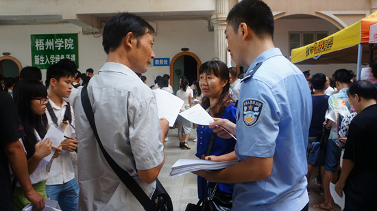 當日上午9時,梧州市公安局富民派出所民警走進梧州學院,與該校保安們一起,在教學樓大廳、校道、宿舍樓下等人流密集點,向學生與家長派發安全防范知識宣傳單張。在教學樓大廳內,大批的入學新生興致勃勃地聚集在民警身旁,學習相關安全防范知識。柳州籍新生小李表示,最近女大學生因搭錯車、網上交友不慎而引發的慘案實在太多了,現在學生的安全防范意識普遍比較弱,她特別希望公安局多組織開展這種類型的安全教育宣傳活動,防患于未然。