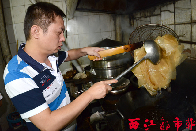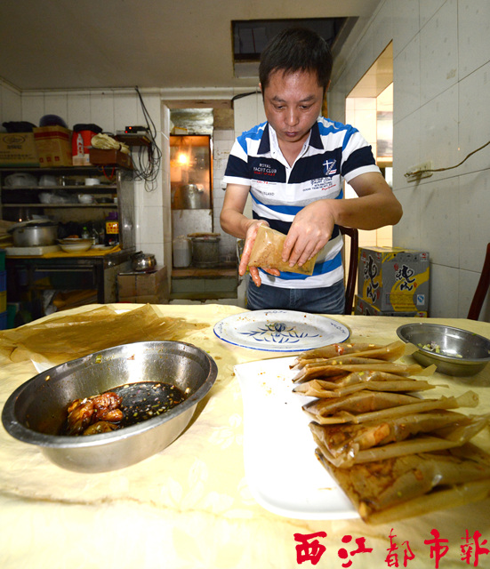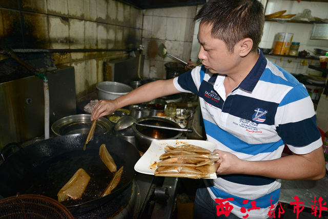 ????為了幫助父親實現傳承傳統美食紙包雞的心愿,陳北水的兒子陳澤賢在1991年開始經營以粵菜為主的粵北餐館,其出品的梧州紙包雞素有口碑。陳澤賢說:“逢年過節,許多老梧州都會來這里訂購紙包雞,自從梧州開通動車后,前來光顧的外地食客明顯增多。”