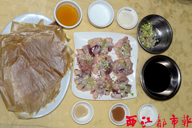 糖、五香粉、生抽、油、鹽、酒、蔥、蒜等眾多材料的調配造就了紙包雞的獨特風味。