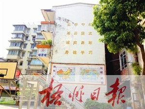 民主路小學(xué)校訓(xùn)聳立在校園的墻壁上。