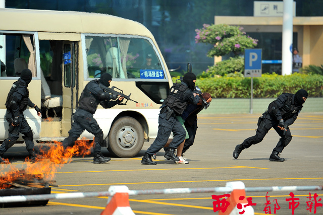 ????本次聯(lián)合演練模擬場景是一架某航空公司航班平穩(wěn)在跑道上降落,當(dāng)旅客陸續(xù)走出候機樓,一伙暴恐分子突然駕車高速沖入停車場,沖撞、碾壓、砍殺群眾,并縱火和實施爆炸,被襲擊群眾四處逃散,情況十分危急。暴恐事件發(fā)生后,機場立即啟動反恐應(yīng)急預(yù)案。