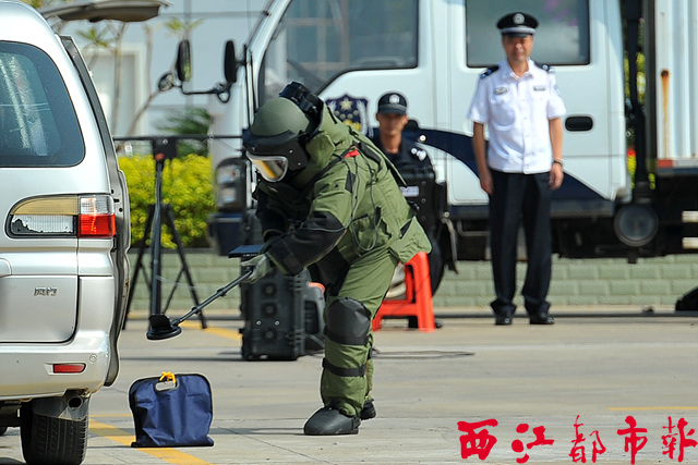 ????在本次反恐聯(lián)合演練中,除了爆震彈、防暴盾牌、龍式裝甲車等常見的反恐設(shè)備悉數(shù)登場外,梧州市公安部門新近配備的排爆機器人、排爆罐、排爆服等裝備也首次亮相。