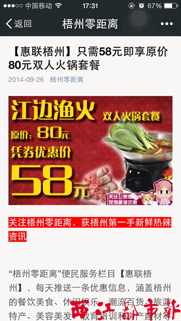 ????除了一些外地大型團購網站進駐梧州,梧州本地也開設了自己團購服務。“惠聯梧州”,是梧州零距離網推出的便民服務類欄目。通過微信,每天推送一條本地優惠的購物信息。“惠聯梧州”扎根本土,其內容,涵蓋了梧州的餐飲美食、休閑娛樂、旅游特產等等。如9月23日,“惠聯梧州”便推出了首屆機器人總動員科普展20元門票優惠券,截至9月25日,已經有112人領取了該門票優惠券。 |