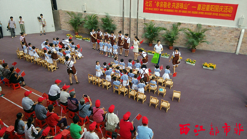 小朋友們在老師的帶領下送上自制的節日賀卡,還左右搖擺著身體,認真地跟唱《歌唱祖國》。歌曲唱到高潮處,不少老人受到感染,也跟著揮舞國旗參與合唱起來,現場氣氛格外高漲。