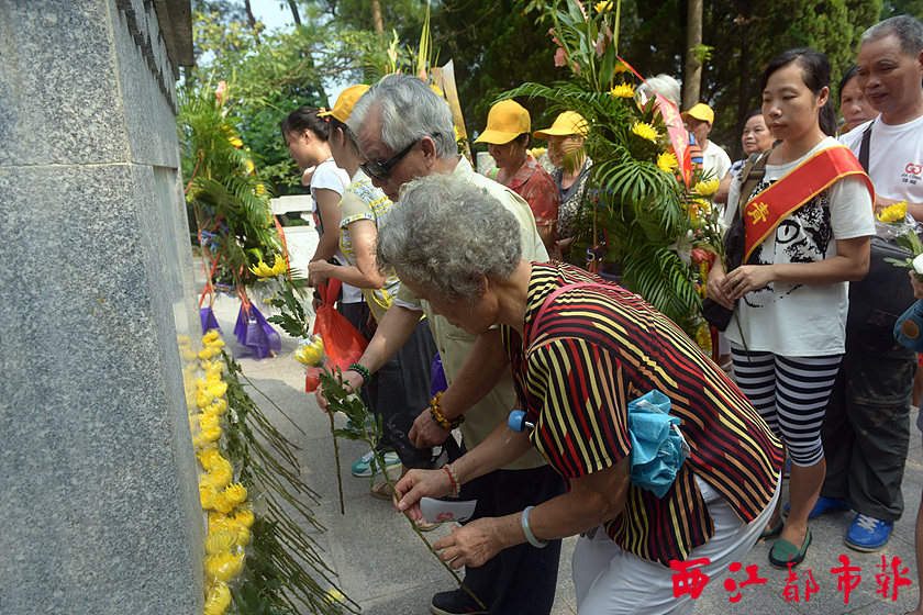 老人家在珠山革命烈士紀念碑前敬獻鮮花。記者 蒙紹松/攝