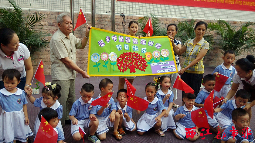 老人家和幼兒園小朋友一起參加升旗儀式。梧州零距離網友“得得斤欠”/攝