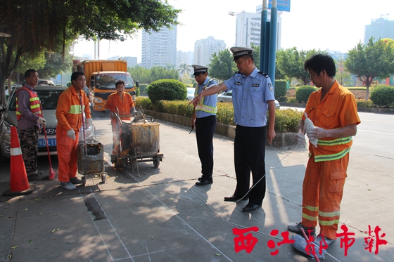 ????在市民的日常出行中,交通標志標線發揮著引導、約束和警示的重要作用。然而,經過長時間的磨損,長洲區部分主要道路的標志標線已經出現不連續、不清晰的現象,在一定程度上誤導了市民出行,而且容易引發亂停車等交通違法行為。在梧州市開展城市環境綜合整治行動中,長洲交警大隊在治理轄區內各類交通陋習的同時,也對道路標志標線進行增設和更新。
