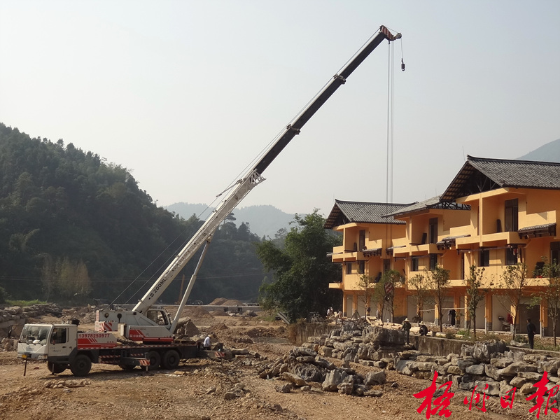 10月10日,在蒙山縣長坪瑤族鄉(xiāng),工人正利用吊機(jī)在長坪河長坪村段兩岸安裝疊石。 今年,該鄉(xiāng)爭取上級中小河流域治理等資金1700多萬元,建設(shè)長兩公里的長坪河防洪堤和兩個水壩,以改善長坪河兩岸景觀,提升“水韻瑤寨”景區(qū)品位。黃東榮 攝