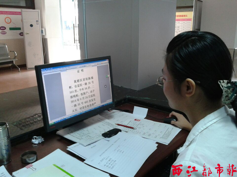 棗沖社區的工作人員為陳錦輝出具相關的經濟情況證明。本報記者 紀榮蘭/攝