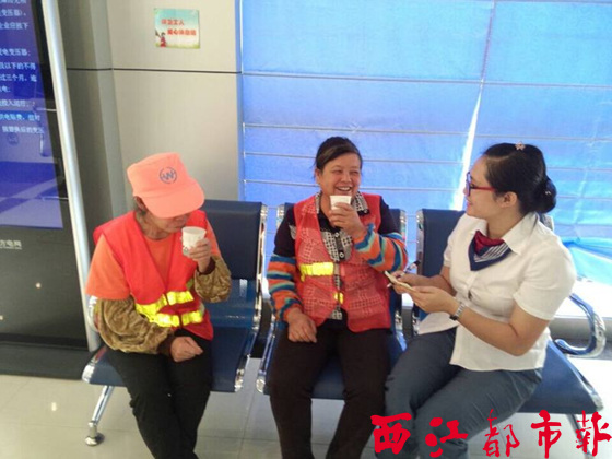在愛心休息站內,工作人員主動為環衛工人遞上熱茶。
