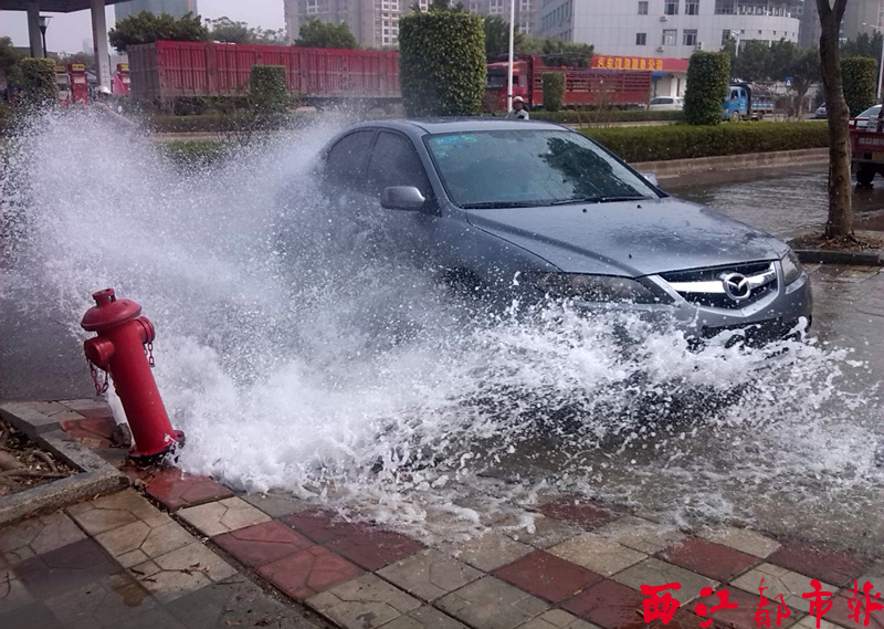 10月15日10時許,在金暉梧州汽車站附近、亨利玫瑰城對出人行道旁的一個消防栓噴出扇形的水幕,引來不少市民圍觀,不少過路的小車更是頻頻駛入水幕中“免費洗車”,至當日中午11點,事發點仍然水花四濺。