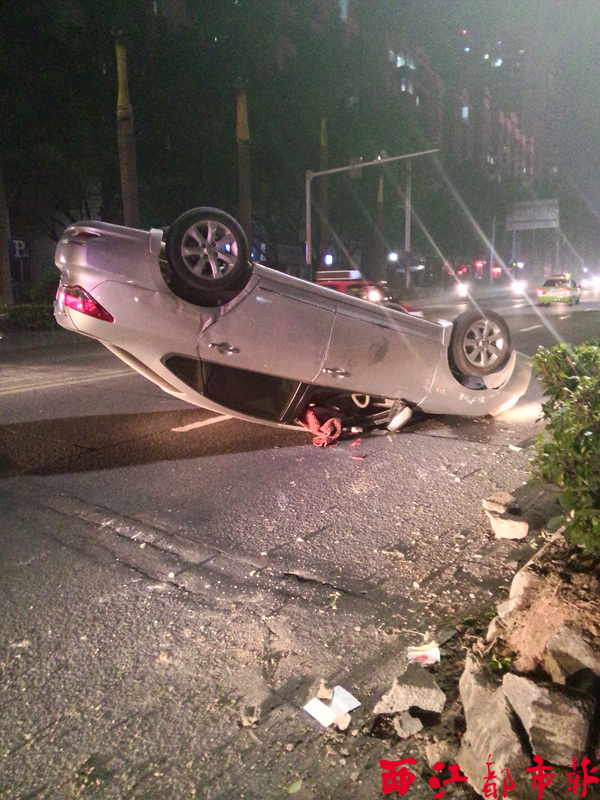 據現場目擊者、梧州市第四中學值班門衛馮先生回憶,22時20分左右,正在值班室值勤的他,忽然聽到“轟”一聲巨響。當他跑出門外時,已經看到該輛小車呈180度翻轉。由于路邊的花基已經被撞損,馮先生推測該輛小汽車是撞到花基后發生側翻的。事后,馮先生和其他一些現場目擊者看到有兩人從小車內爬出,但由于圍觀群眾較多,大家都無法確認兩名人員是撤離現場抑或在現場守候。