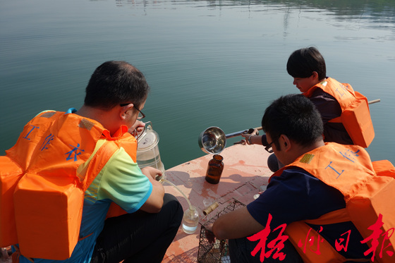 環保監測工作人員在自來水水廠水源地取水采樣,分瓶包裝,以便帶回實驗室進行項目檢測分析。梁萍 攝