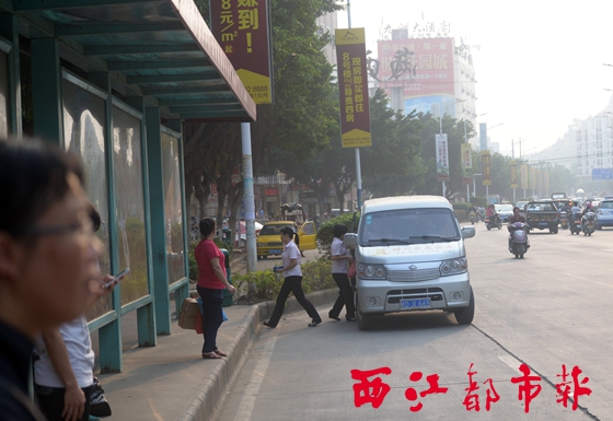 10月14日,一司機將面包車停靠在新興二路一個公交站內,讓車上的乘客下車。 本報記者 蒙紹松/攝