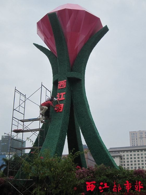 10月23日,工人在市政廣場正門布置大型寶石狀花柱。為迎接第十一屆梧州國際寶石節,市政廣場內將舉辦梧州市第十五屆市花寶巾花展。目前各參展單位已開始進場布展。 通訊員 鐘宇豪/攝