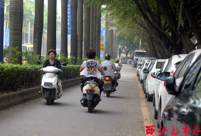 10月24日,有市民駕駛摩托車或助力車,在新興二路的非機動車道上行駛。 本報記者 蒙紹松/攝