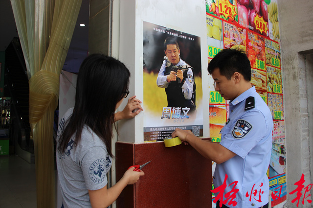 ????10月27日上午,民警在藤縣縣城繁華地段張貼“我最喜愛的人民警察”海報。