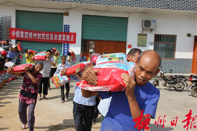 ????10月28日,在蒙山縣新圩鎮(zhèn)雙垌村,中恒梧州制藥(集團(tuán))股份有限公司向貧困村民發(fā)放肥料。