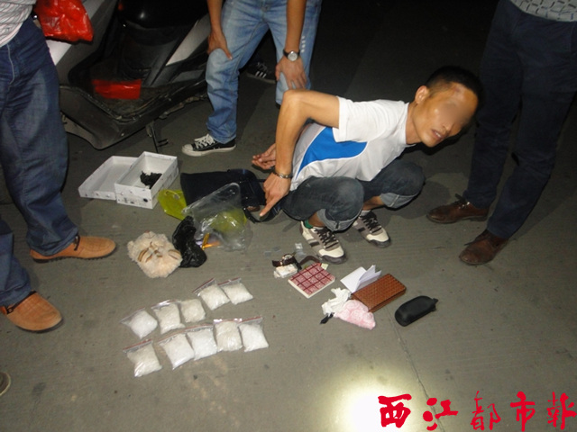 民警當場將接貨的犯罪嫌疑人謝某培控制,并在其身上及駕駛的助力車上查獲一批冰毒及海洛因。