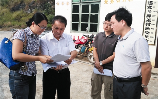 郵儲銀行廣西分行三農(nóng)金融部總經(jīng)理王墨(右二)赴忻城縣遂意鄉(xiāng)弄堯村調(diào)查黑山羊養(yǎng)殖項目。