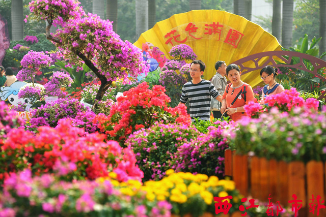 ????今年的第十五屆梧州市寶巾花展吸引了16家單位參展。美輪美奐的造型寶巾花盆栽展現的是梧州的生態美,更是一個個團體的凝聚力與創造力的見證。你看,市政廣場上這座既有小橋又有流水還有涼亭的寶巾花微型公園,仿佛是玫瑰湖公園的縮影。梧州市玫瑰湖公園管理站站長黃永雄說,這個寶巾花造型設計以“鄉韻”為主題,設計理念就是將寶巾花種植向家庭庭院綠化方向推廣,“現在人們的生活越來越好了,下一步該思考的,就是怎樣美化自己的家園。”